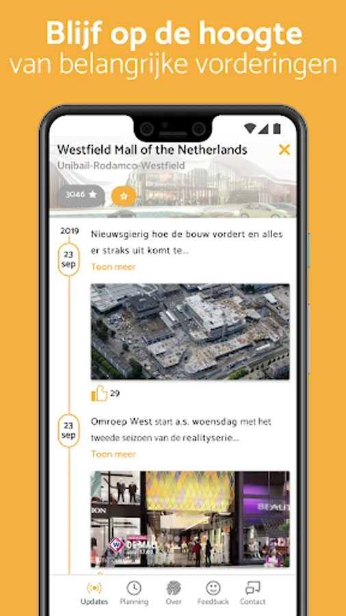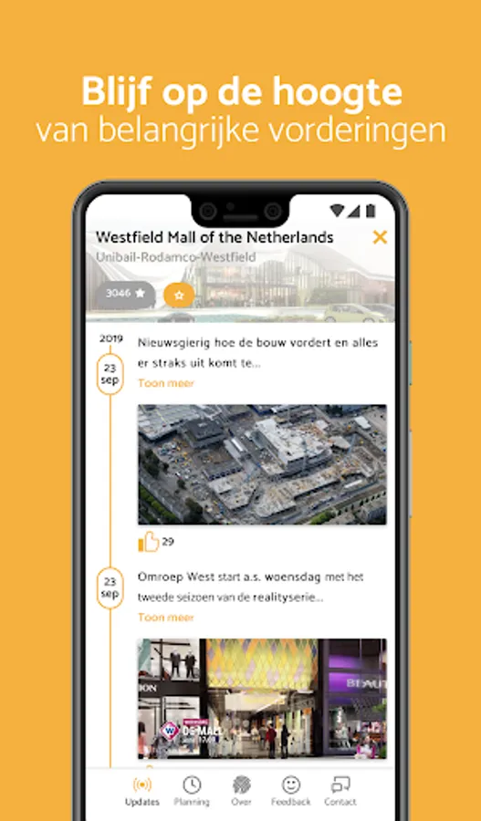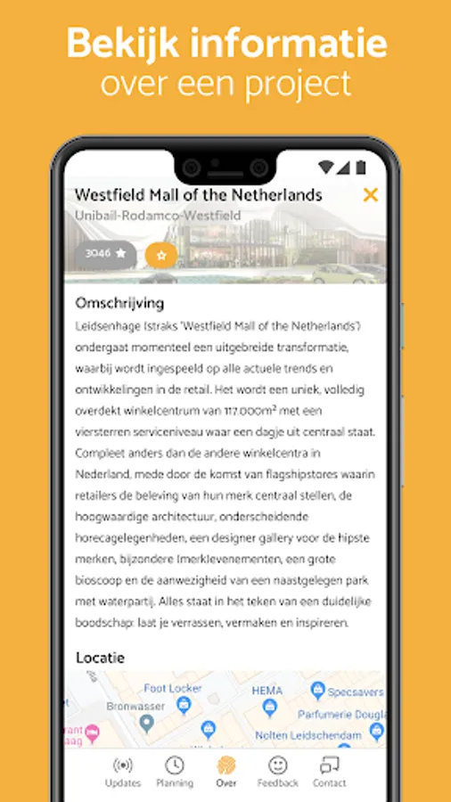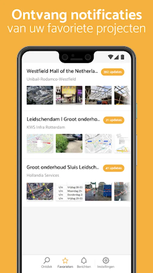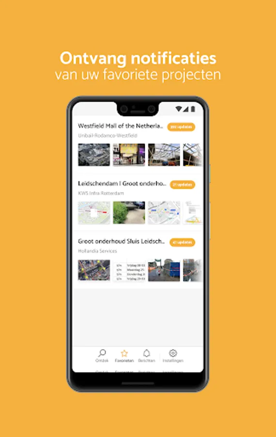 With the BouwApp you can add construction and infrastructure projects to your favorites. You can continue to follow these projects without having to start the App each time. You will receive a signal with every new update. This way you are the first to be informed of the latest developments.