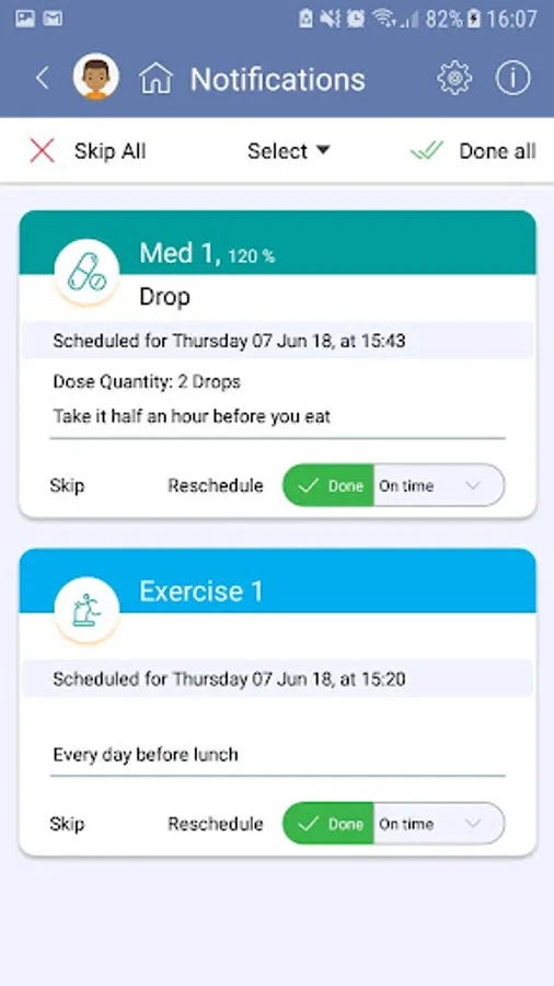 • Alerts when it’s time to take a medicine and asks the user to insert their feedback (ex: Already Took, Take Now, Skip, Postpone, etc)