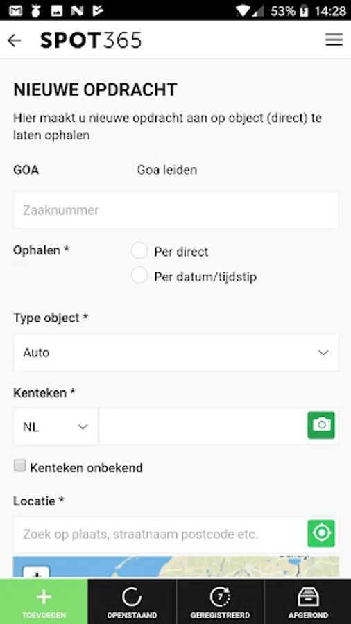 The app allows you to take photos of the vehicle / registration. Vehicle data are enriched and the application passes this on to the control room and berger.