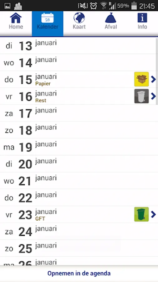 The app contains an extensive, digital calendar in which the collection days of your waste are indicated. This applies to all waste streams, i.e. residual waste, organic waste and paper. You can also import these collection times into your own calendar and set up a timely reminder.