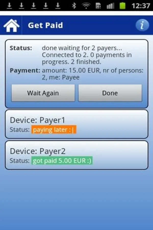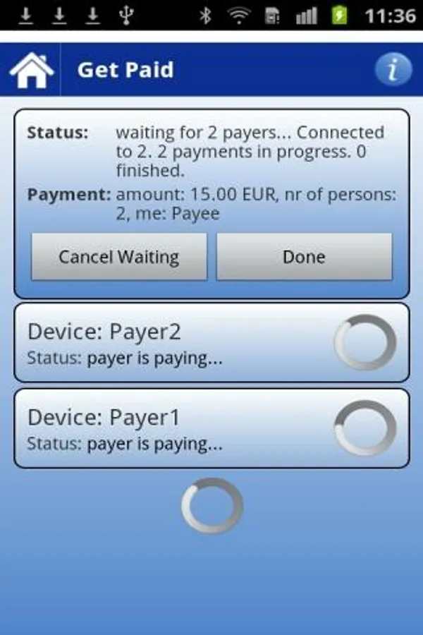 That allows the Payee to enter the nr of persons that have to pay, the amount the have to pay, etc. Pressing Get Paid then makes it wait for Payers to connect. In short, the payment is "pushed" to the payers.