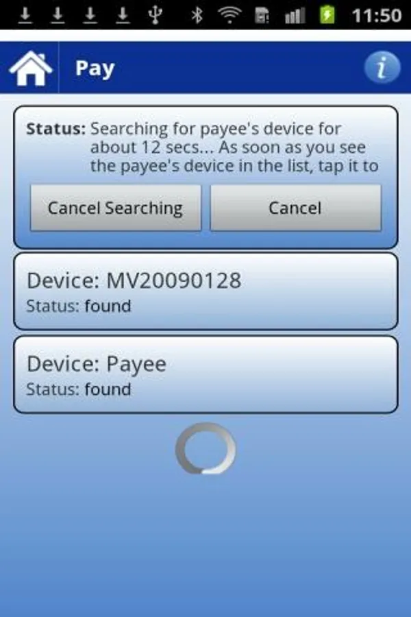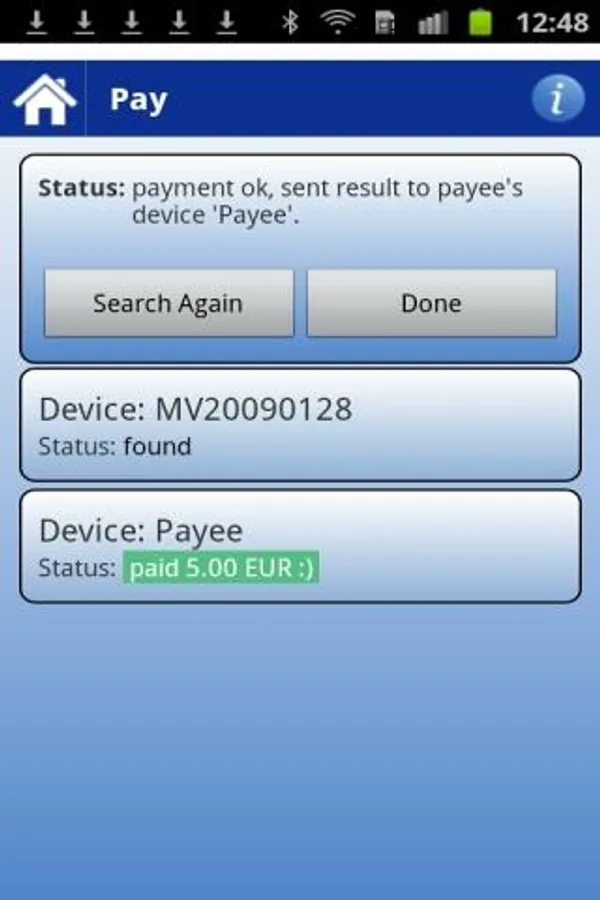 Your friends (the Payers) also have started the Going Dutch app. They press the Pay button after which it goes searching for a Payee device. As soon as it shows the right one, the Payer taps that entry. The Payer's app then receives the amount information from the Payee device, shows it, allows the Payer to overwrite it (for example his main course was more expensive), and the Payer can pay via the regular PayPal interface.