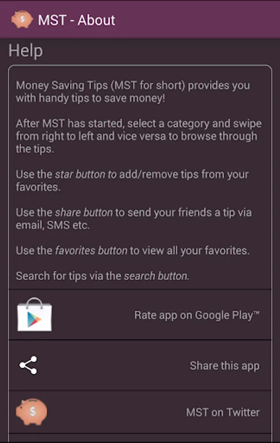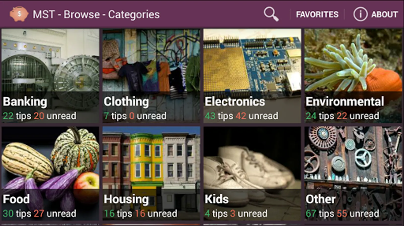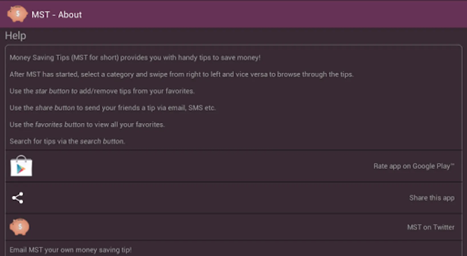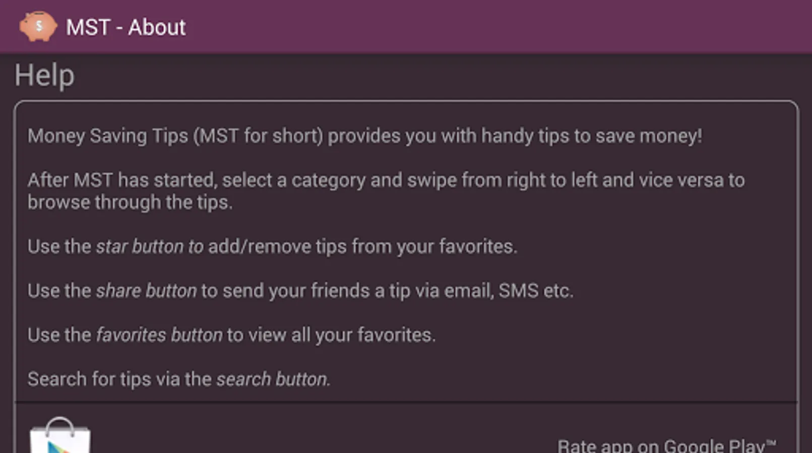 The free Money Saving Tips app (MST for short) gives you over 260(!) handy short money saving tips.