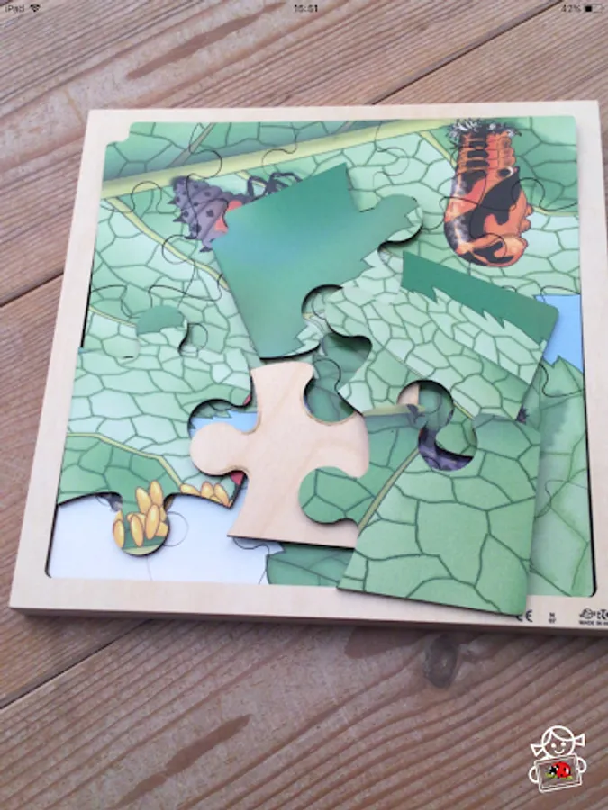 Aim your tablet or phone on the wooden puzzle and the puzzle comes to life. Each beautiful drawing changes in a fascinating short film.
