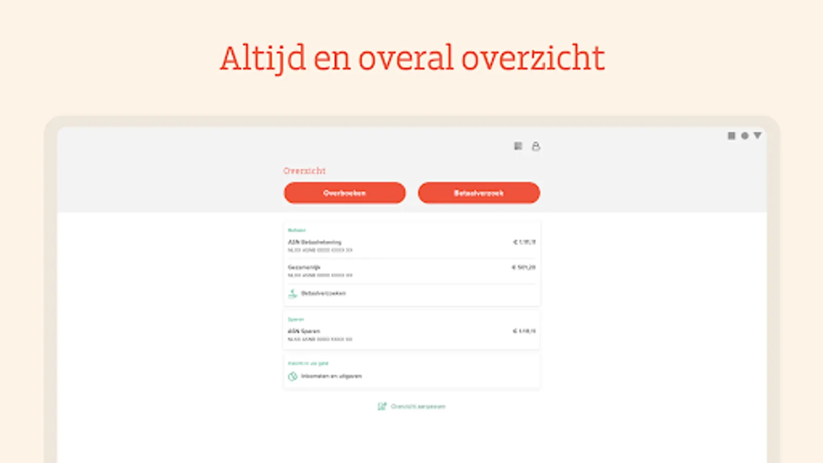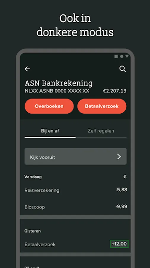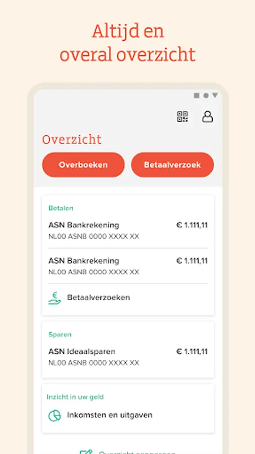 Transfer money, view your balance and pay with your mobile phone. With the new ASN app you can easily arrange your sustainable banking. You can use the new app with a private account, insurance or mortgage.