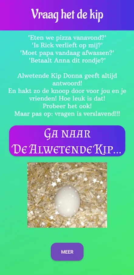 A chicken as a fortuneteller? Yes! For real! Kip Donna answers all your closed questions! The first app where a chicken helps you make decisions.
