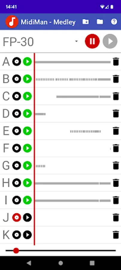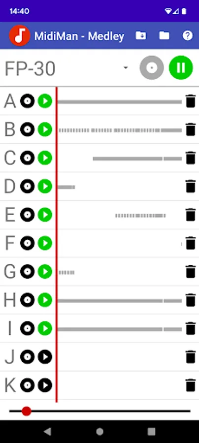 MidiMan is a sequencer that can play and record music from MIDI instruments using USB or BLE (Bluetooth Low Energy). You can record 1 track and play up to 15 other tracks simultaneously. MidiMan can import and export music from MIDI files. For USB you will need a USB On-The-Go cable.