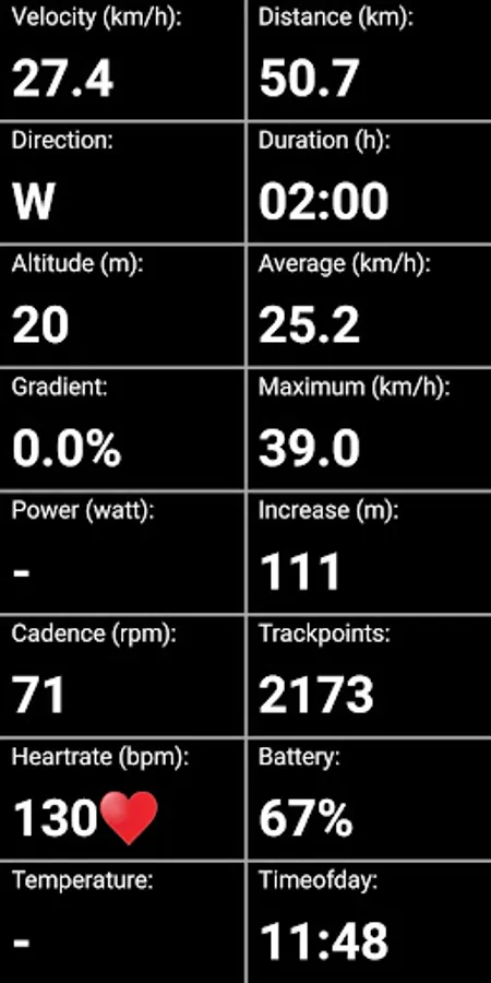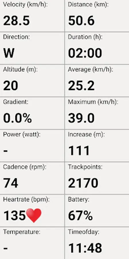 Depending on the available sensors, TrackWay will show data fields like velocity, distance, average, maximum, altitude, increase, gradient, power, cadence, heartrate, duration, trackpoints, direction, temperature, timeofday, battery.