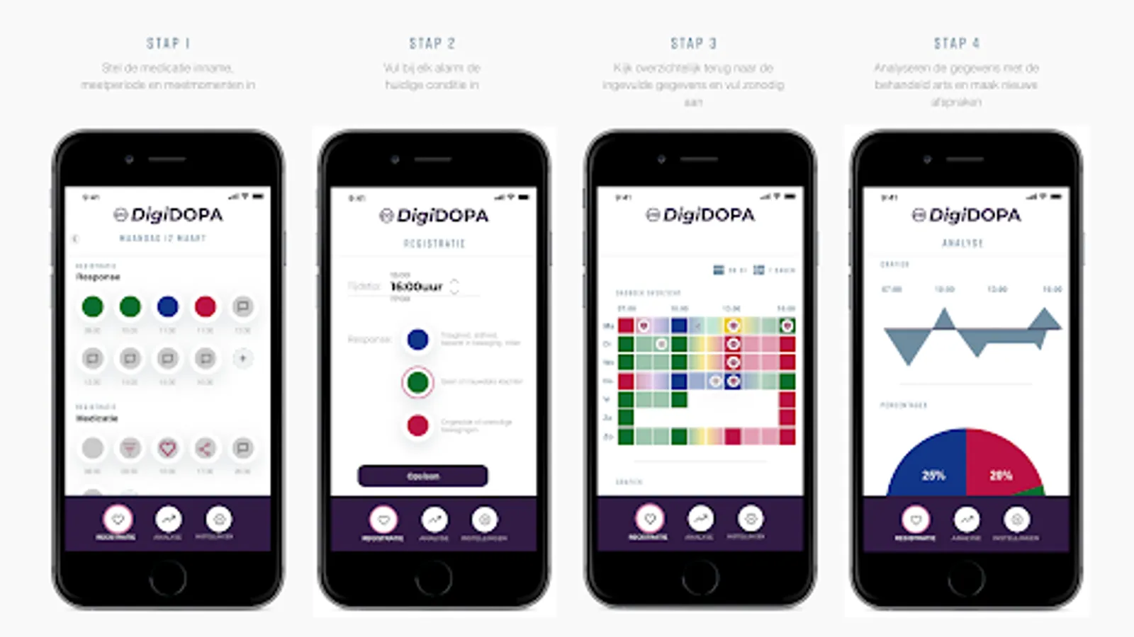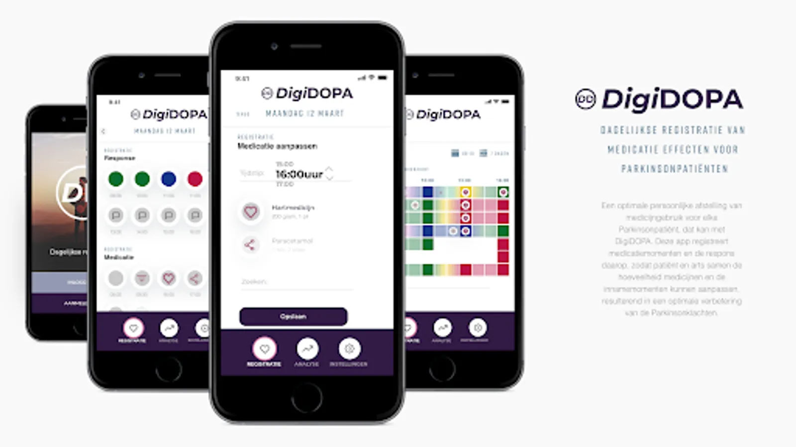 An optimal personal adjustment of medication use for every Parkinson's patient is possible with DigiDOPA. This app registers medication times and the response to them, so that patient and doctor can jointly adjust the amount of medication and the times that they are taken, resulting in an optimal improvement of Parkinson complaints.