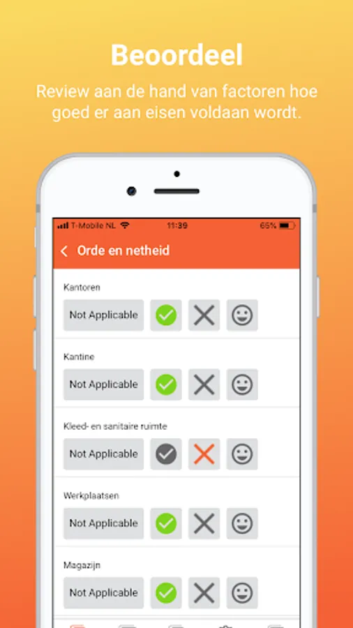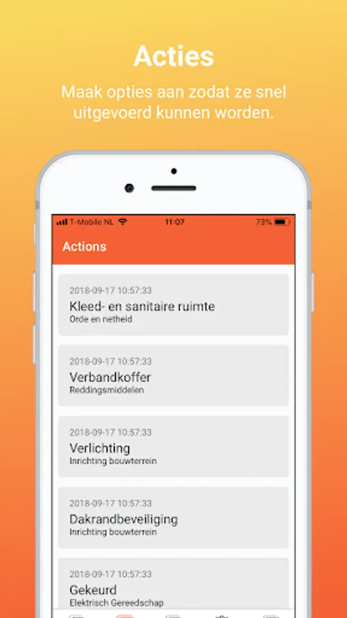 On the basis of the App existing checklist you go through the relevant SHE aspects for a workplace inspection. Not current or relevant topics or questions click easily from ensuring ease guaranteed. If a subject is not in order, you can ask by entering a comment or action that is sent in the report and, like the inspections as a reminder in your App remains. Reporting dangerous situations or (almost) accidents also is very simple. Here you choose the category of the message and you have an opportunity to make a picture of the situation or to add.