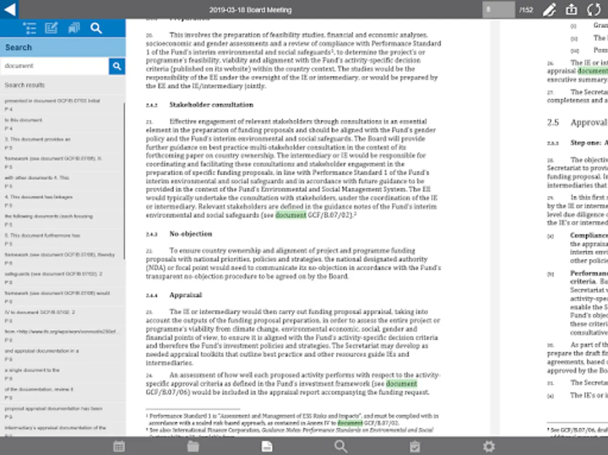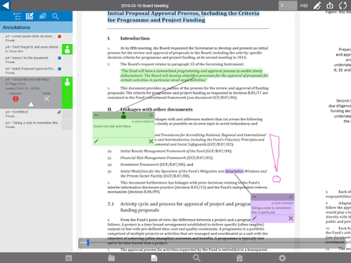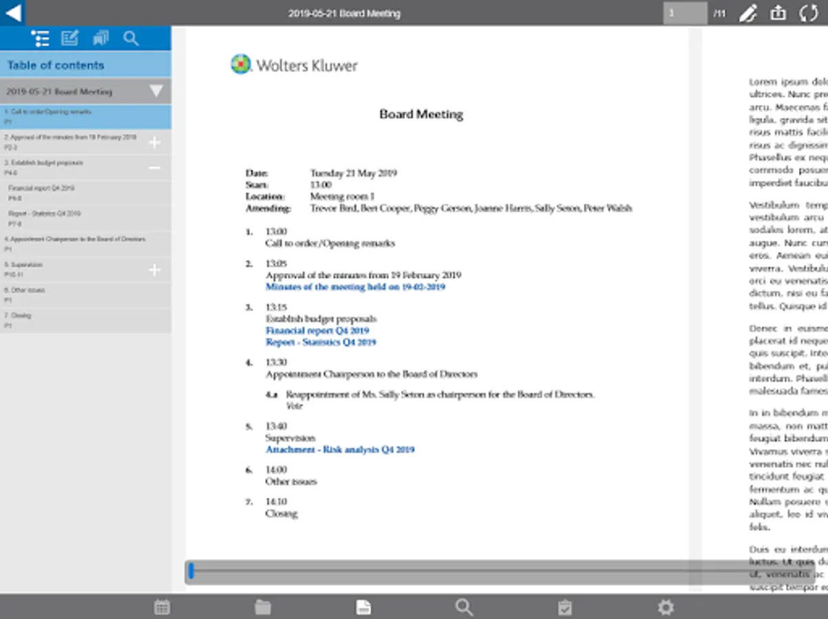 Preparing a meeting is so easy. For each meeting you receive just one PDF document, which includes the agenda, the attachments, minutes and documents received. Our unique PDF reader allows you to annotate the agenda, minutes or received document wherever you want. Those endless stacks of separate documents are a thing of the past: now you have everything neatly in one place. Annotating is simple, and you can share your notes with your colleagues during, but also before the meeting. Your notes are saved, and placed back into the document after an update of the agenda or attachments. The archive is immediately available and fully searchable.
