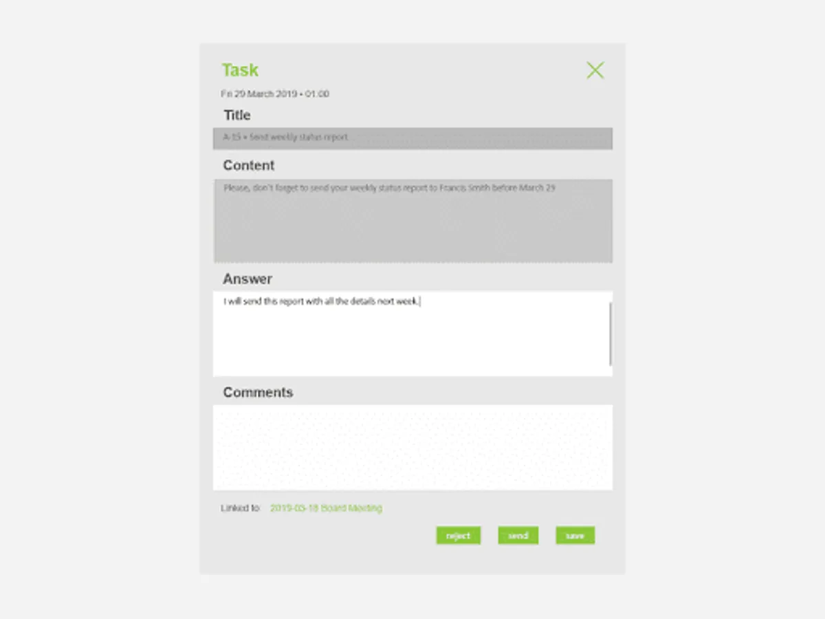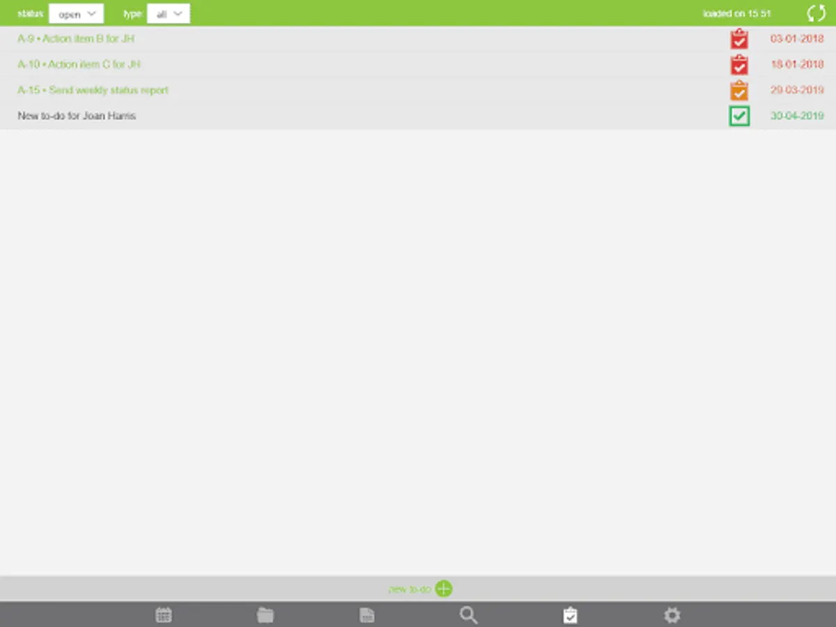 Have more control over meeting results. Check the status of action items whenever you want. Edit the agenda structure right until the last minute. Shorten the meeting time by asking questions to the participants per agenda item before the meeting. All decisions and the complete archive are always available to you.