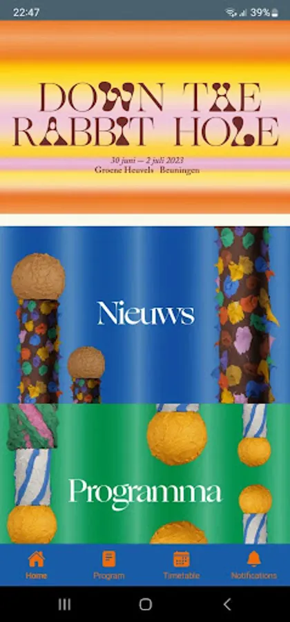 Discover your new favorite artists in the Down The Rabbit Hole 2023 app. Stay up to date on program announcements and updates, search for caterers and find the answer to your questions in the FAQ. The timetable is also available in the app.