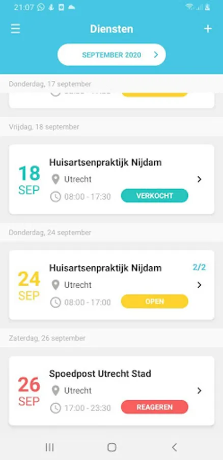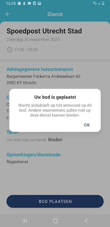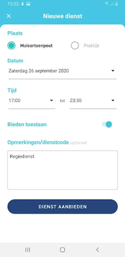 SALES SERVICES – Practitioners go to their services page and click on the '+' at the top right of the screen. The first choice is between a GP post or practice. Then the date. After filling in the times, a choice of rates follows: specify the rate yourself (possibly with the remark 'rate negotiable') or have an observer make an offer. For multi-day shifts, place comments on the first shift of the series. For multi-day services, answer the question 'Would you like to offer more services?' In the subsequent screen, the next working day will automatically appear with all fields pre-filled, confirm again, etc., until the series is completed.