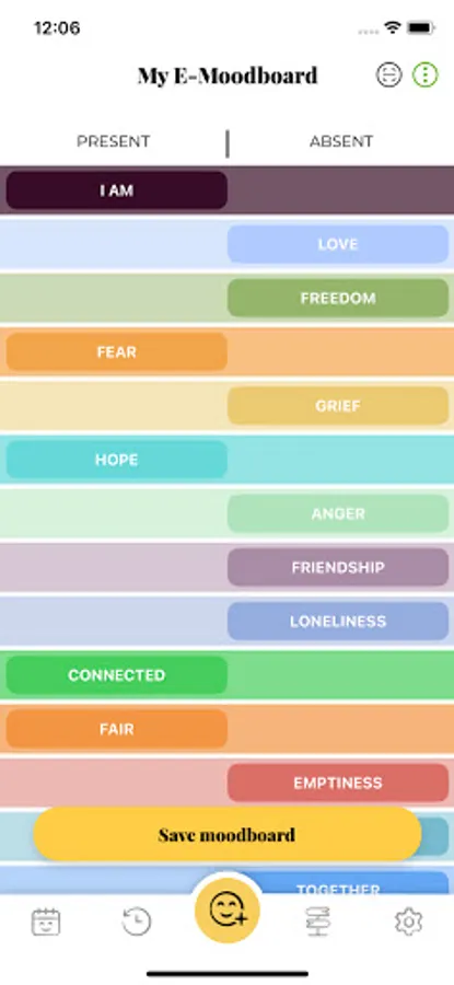 E-Moodboard can help to understand your emotions and feelings by asking yourself the question: What emotions am I feeling today? You can determine the answer in the moodboard by shifting the 40 signs that represent emotions, feelings and thoughts.