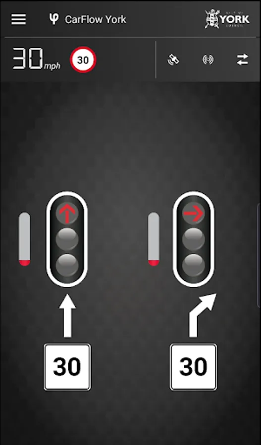 How does it work? CarFlow York communicates the expected behaviour of the next set of traffic lights to road users. When approaching a junction, SWARCO's FlowSense sends real-time traffic information to the app. This data is then continuously analysed and an advisory speed will appear on the driver’s in-car device giving the driver the best chance of arriving at a green light without needing to stop.