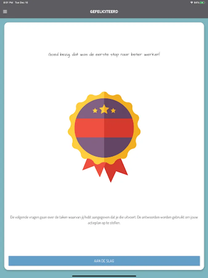 Each day do 42% of the working people physically demanding work. Hard work comes in many sectors and can have health consequences and lead to absence or incapacity. Nobody wants to get physical symptoms or are completely extinguished evening of work. It's not normal to get here complaints. You can do something about it! Experience all your complaints through hard work at the moment? Or do you sometimes little energy for your hobbies or sports? Then this is your chance to understand how tough your work and think about an action plan to make your job less stressful. This app helps you to proceed healthier. The Tax Aware app helps you to choose your own health. Choose consciously taxing and stay healthy at work.