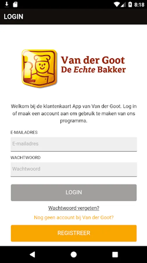 With Bakker Van der Goot's App you have an extra indent. Save for advantage and use special offers for our loyalty cardholders. If you do not have a card yet, you can request one with this App by completing the registration. If you do have a card, and you want to link that card to this App, use the same e-mail address that you provided when you received the card when logging in. This is the e-mail address to which you receive emails from us from time to time. The password you need to log in can be (re) requested by clicking [forgot password]. With the Van der Goot App your advantage starts immediately.