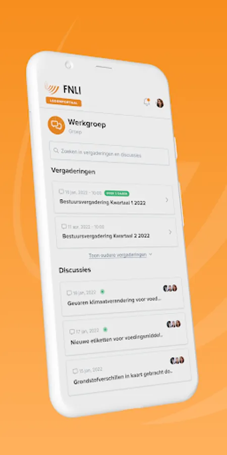 The Federation of the Dutch Food Industry (FNLI) is the umbrella organization of processing and importing companies and branches in the Dutch food sector. The FNLI represents and supports its members in the areas of sustainability, economic affairs, health and food safety. Based on your personal preferences, our app keeps you informed of the current, relevant news and you always have access to knowledge documents within your field and meeting documents. You will find your personalized agenda, an overview of activities for which you can easily register. In addition, you can contact experts and colleagues within the sector via the FNLI member network in the app. The FNLI member portal app is exclusively for members of the FNLI. Information is not accessible to third parties. With this app you get the most out of your organization's membership.