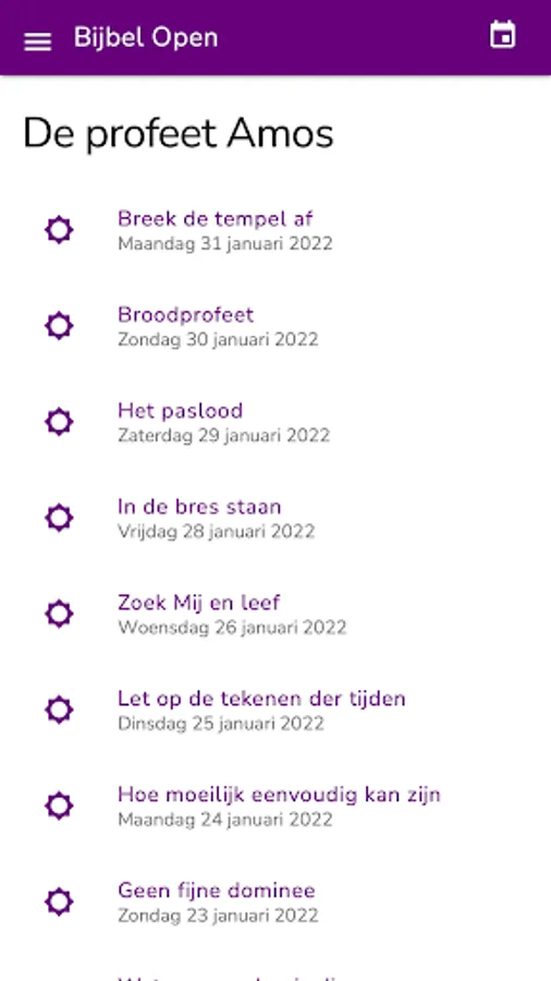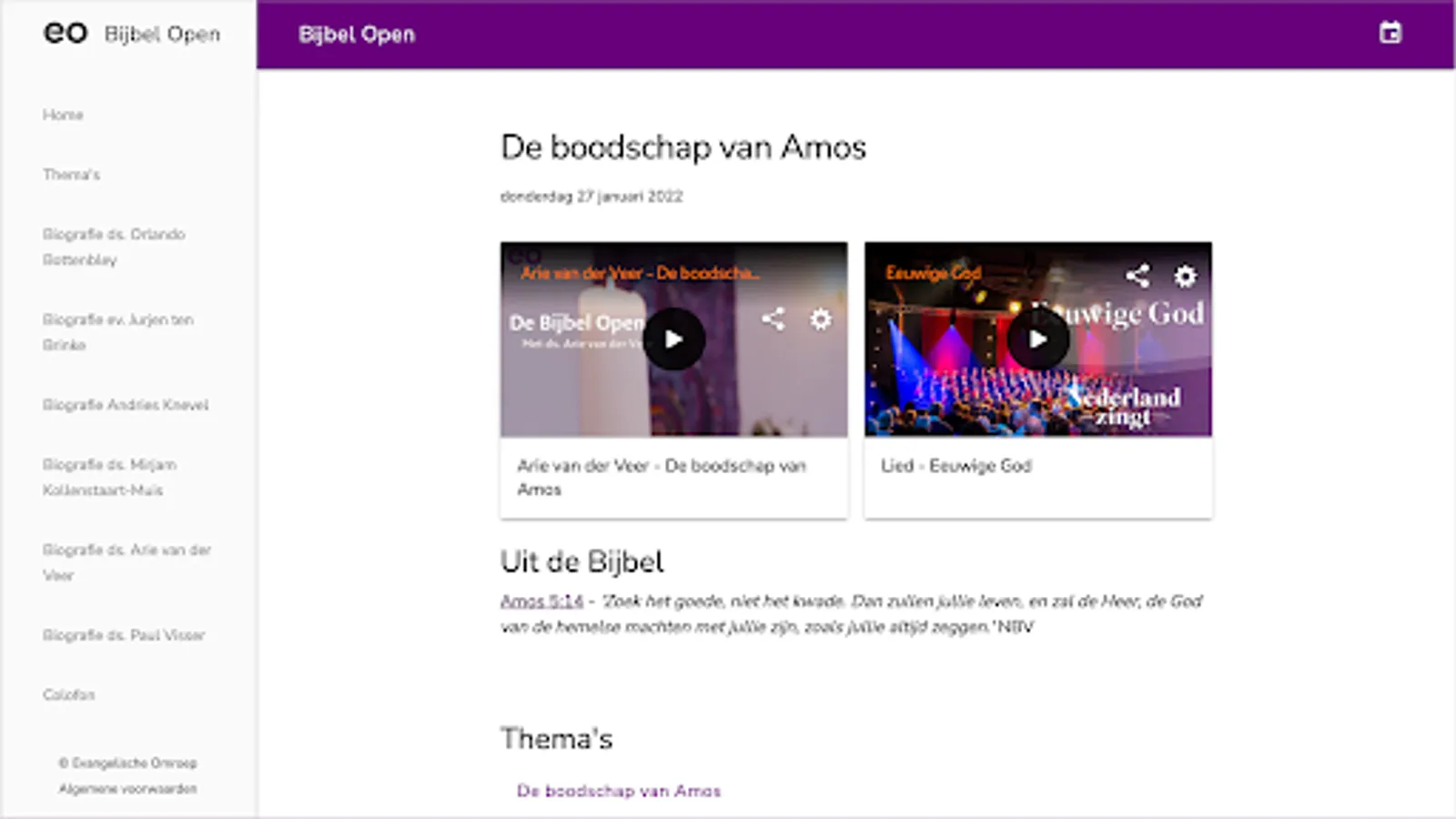 Every day the EO Bible Open app offers video meditations by different speakers, a short reflection from a Biblical diary and a beautiful song from Nederland Zingt. This app is an easy way to get together around an open Bible. EO Bible Open app is part of EO Nederland Zingt.
