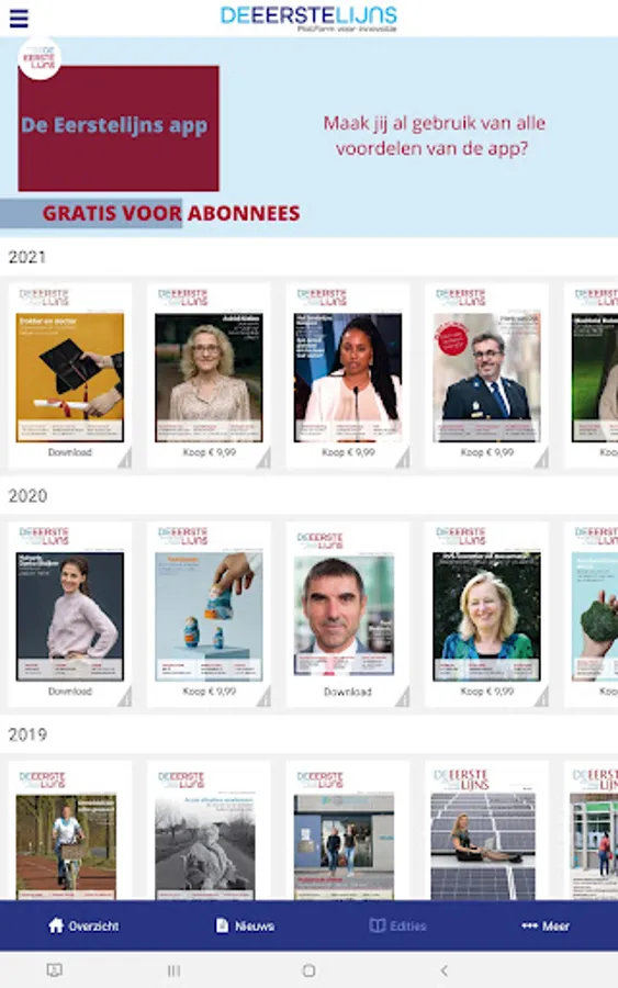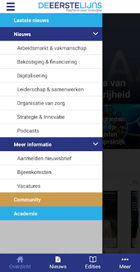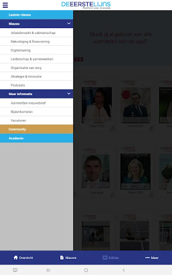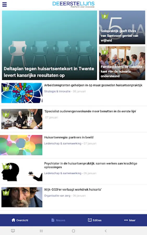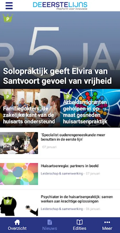 De Eersteelijns started in 2009 as a magazine and online community for the collaborating primary care provider. The first website has been added since 2010 and De Eersteelijns partners have been included in the service network. In 2011, the portfolio was expanded with conferences and meetings such as the First Line Transparency Congress, The First Line Gala and The First Line Substitution Congress. Structured cooperation has also been entered into with knowledge institutes such as ZonMW, Jan van Es, NIVEL and Vilans.