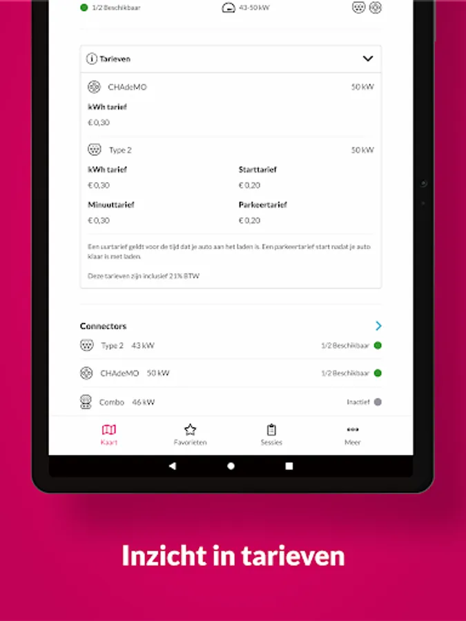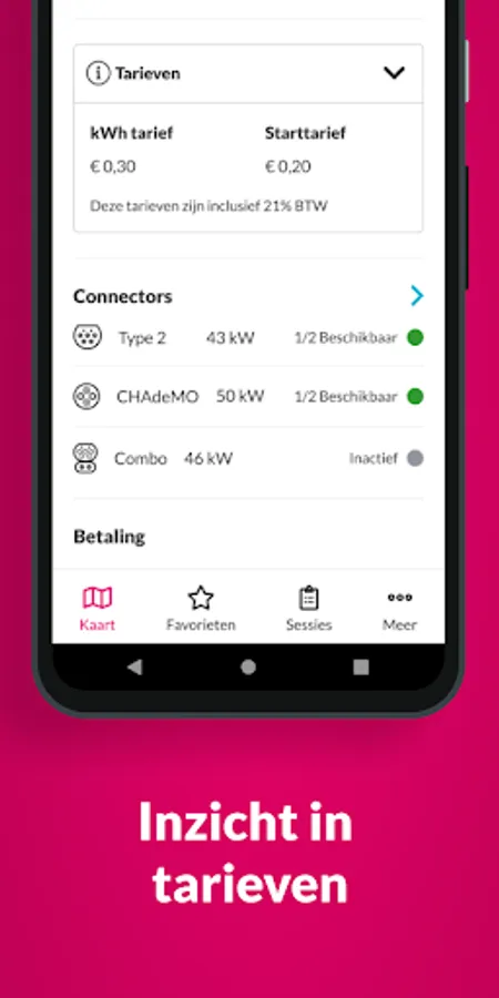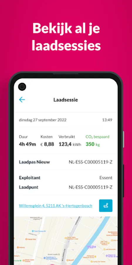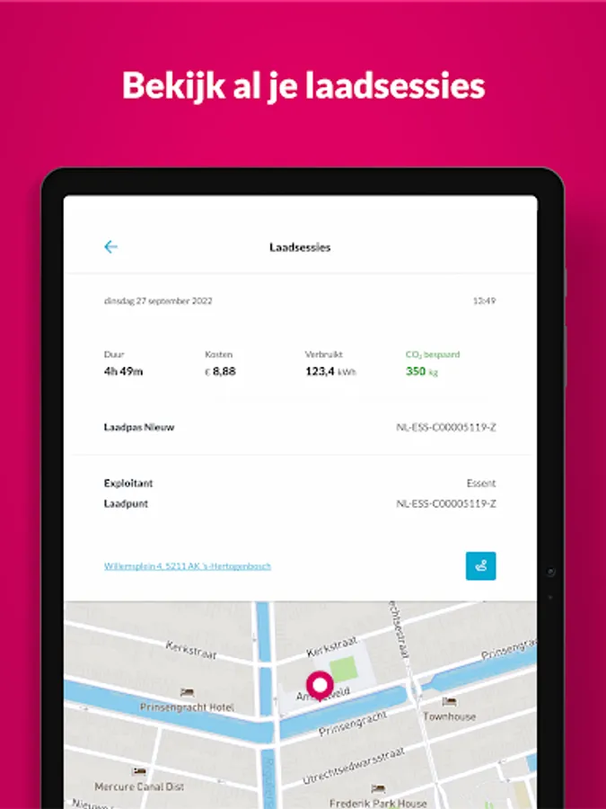 The Essent Electric Charging app gives you a handy overview of all public charging stations in the Netherlands and in a large part of Europe. Do you have an Essent charge card? Then you will see a complete overview of all your charging sessions and the costs in the app.