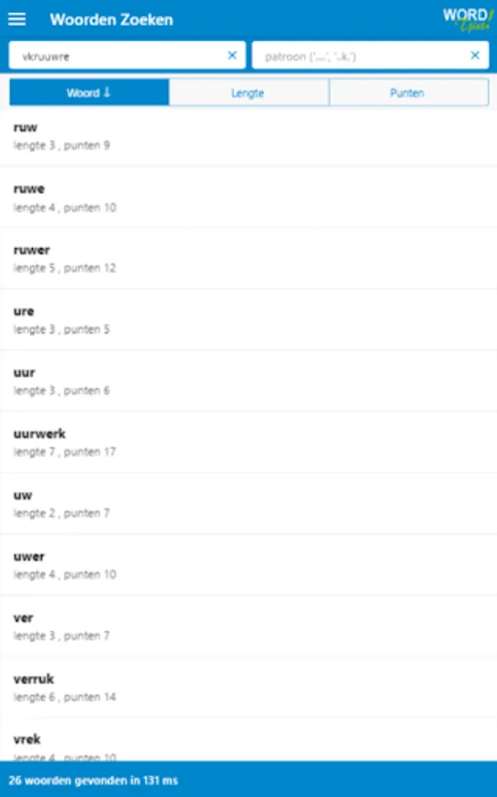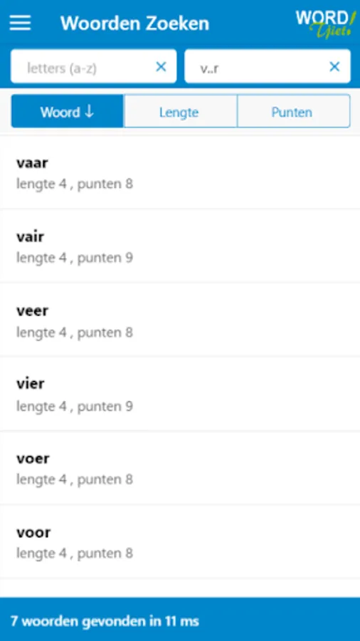By the word search, simply enter the letters that make up a word may consist find word search WordTjiet for you all the words that can be created with the given letters. You can also specify how many letters the word may exist and in what position in the word must be a specific letter.