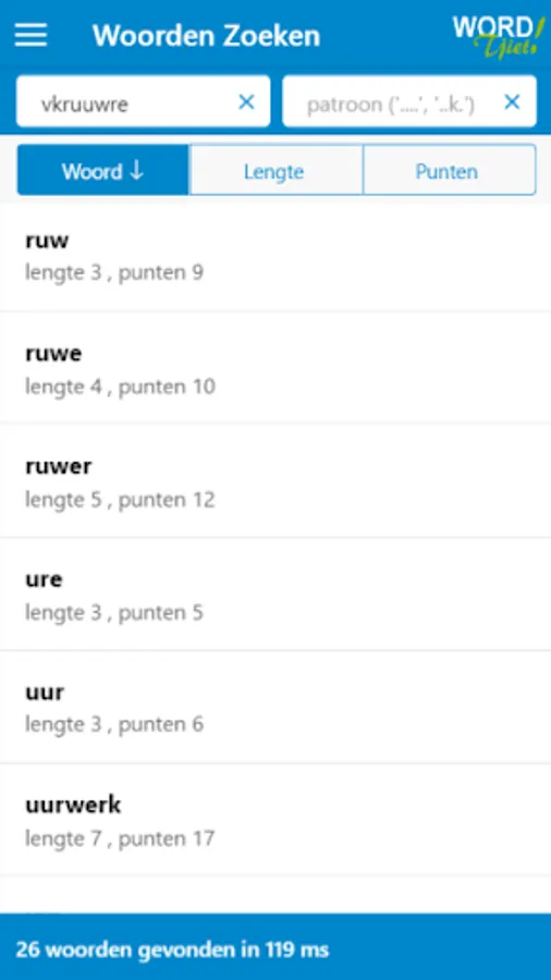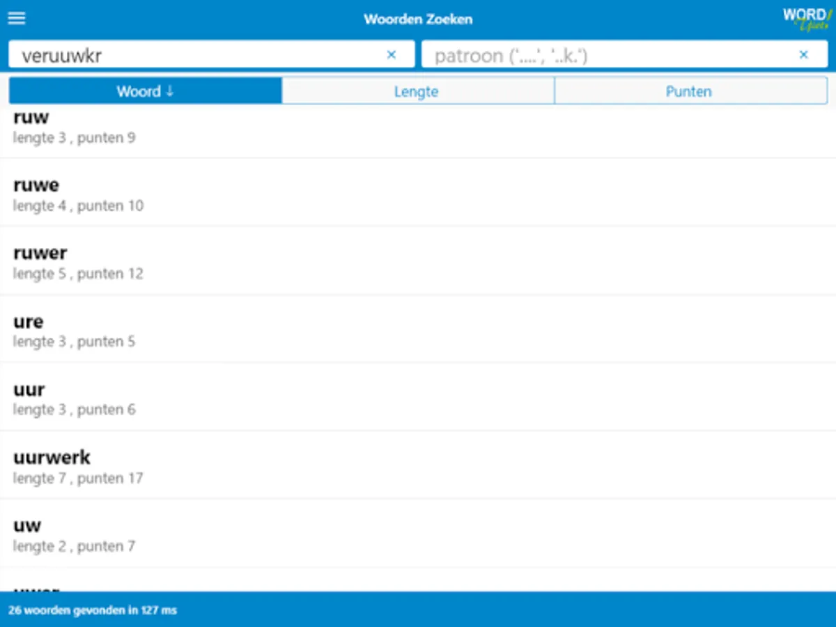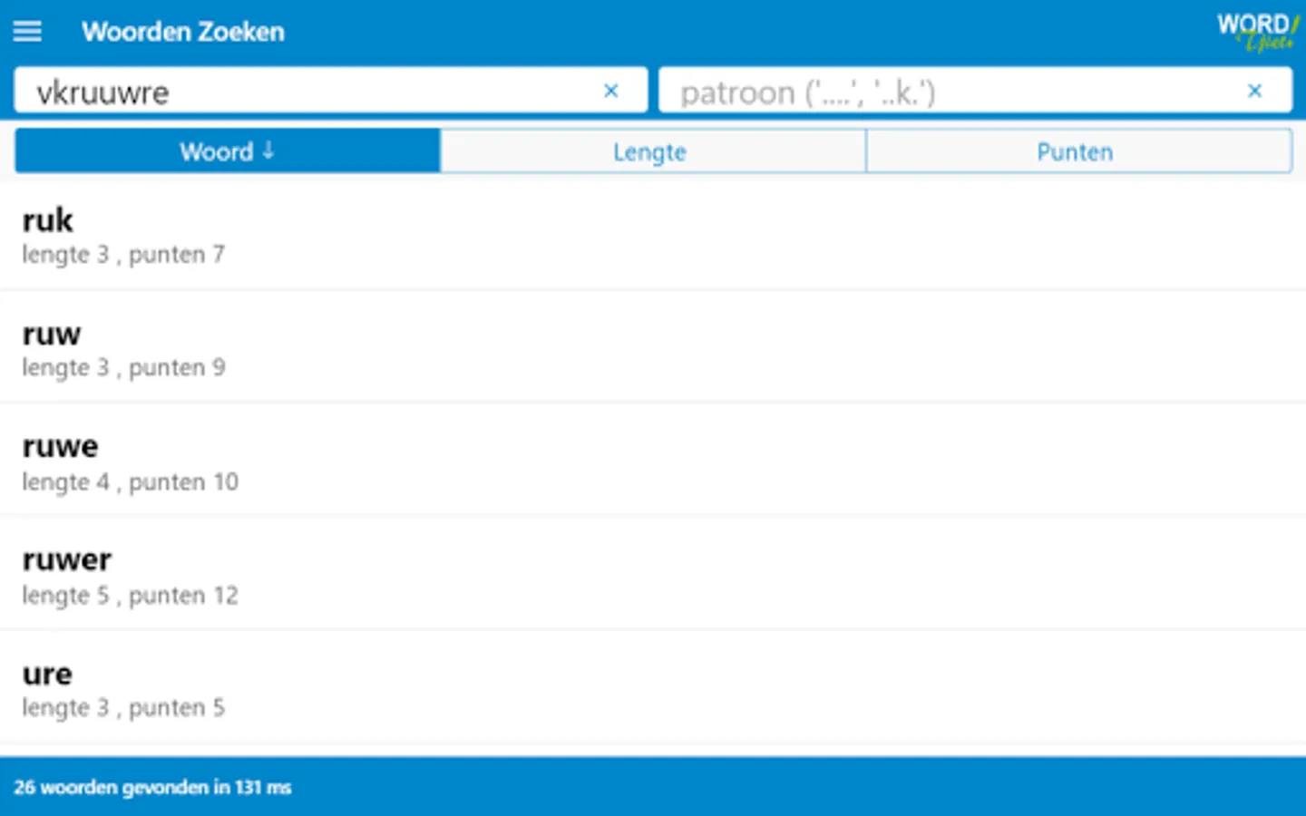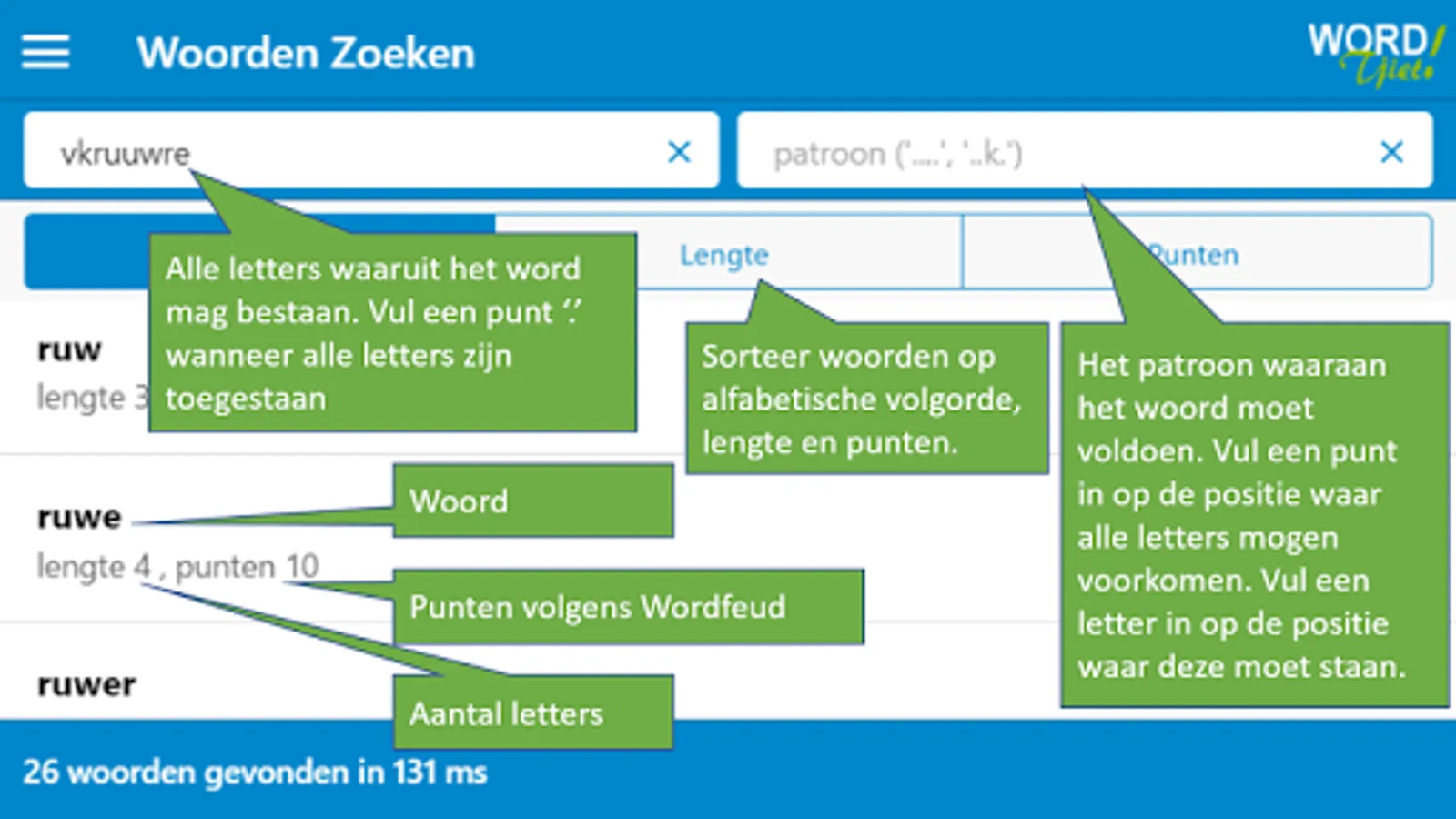Wordsearch WordTjiet! is a word search app that provides an easy way to quickly find good words for all sorts of word games, such as Wordfeud and Scrabble.