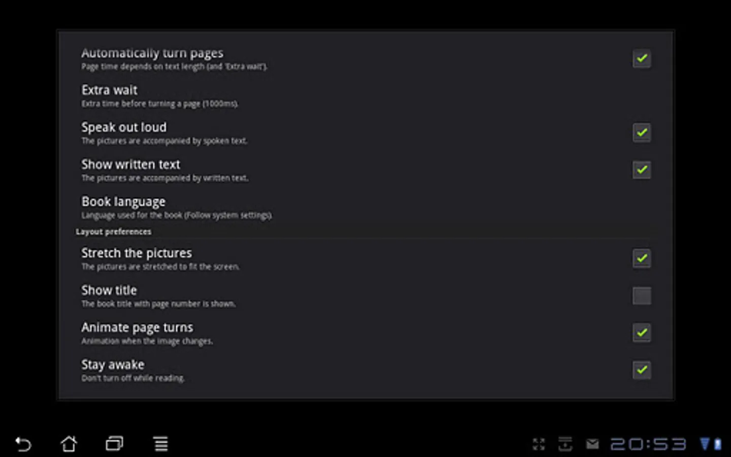 Young children can enjoy the book by themselves due to the reading aloud, the automatic turning of pages, and the captions being switched off. Older children can read for themselves by switching off the reading aloud and automatic page turning, and switching on the captions.
