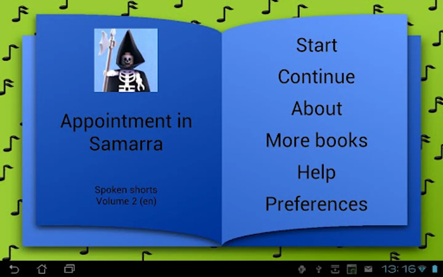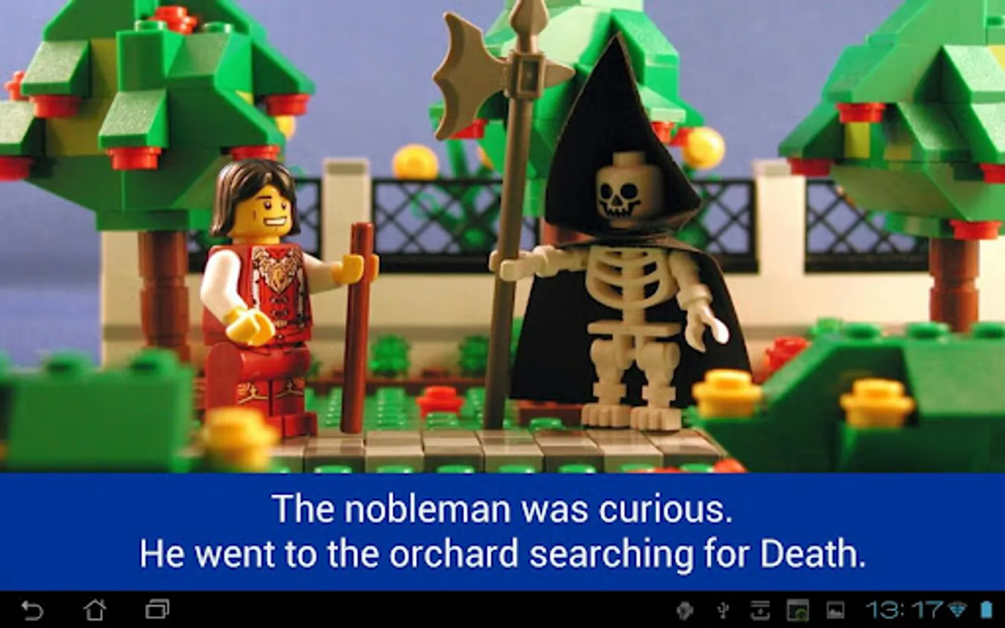 This application is a picture book that reads aloud the famous story of the Appointment in Samarra. In this story, a man tries to escape from Death, by going to another city.