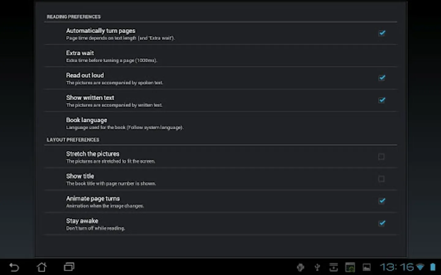 Young children can enjoy the book by themselves due to the reading aloud, the automatic turning of pages, and the captions being switched off. Older children can read for themselves by switching off the reading aloud and automatic page turning, and switching on the captions.
