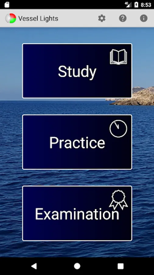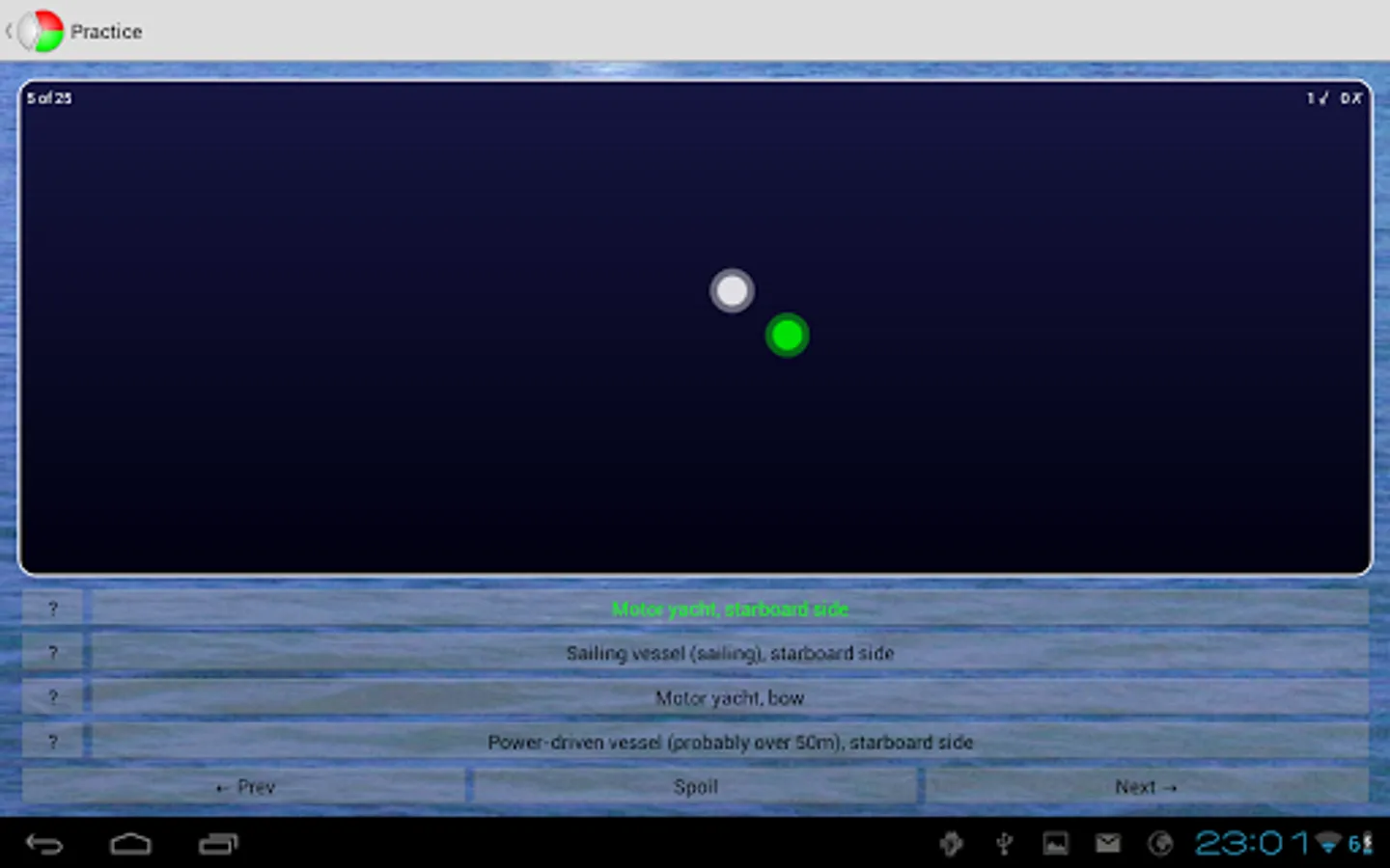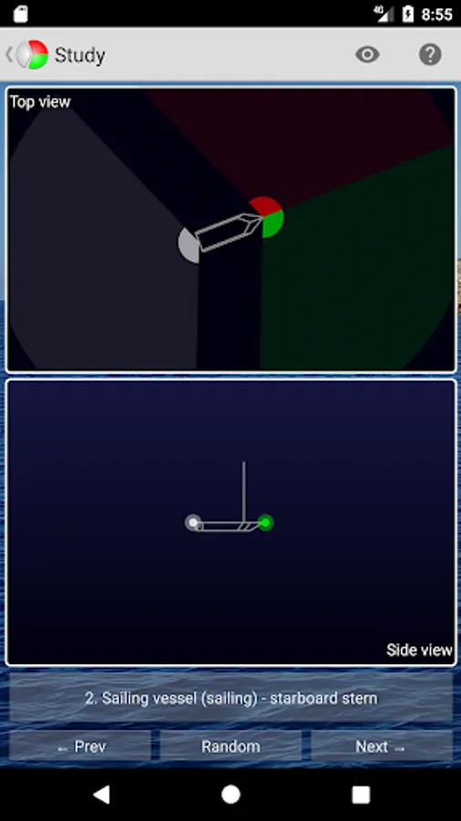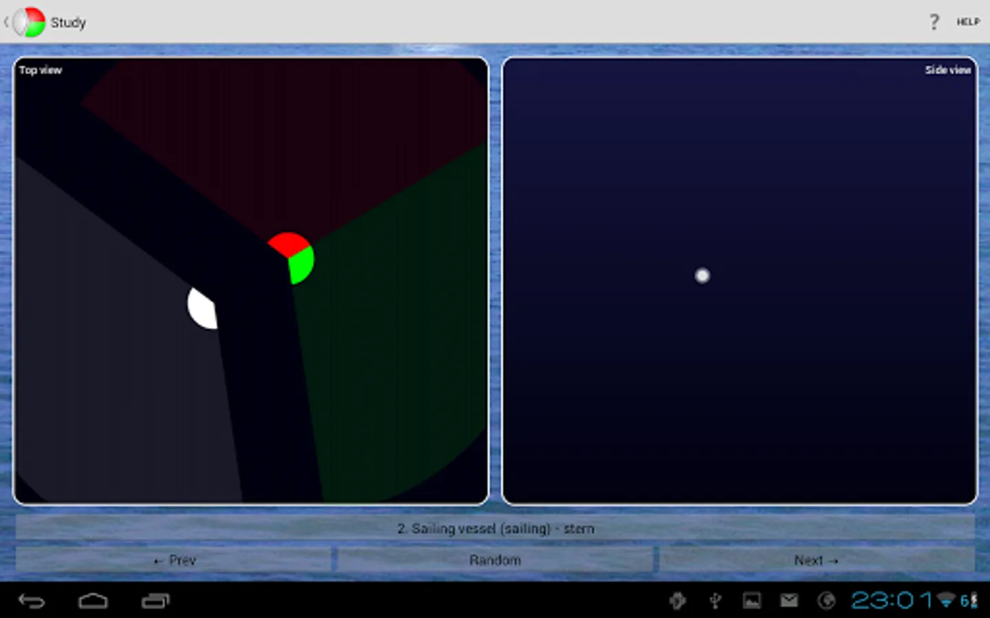 Learning in this app takes three stages. In the first stage "Study", the vessels can be browsed, and each vessel shows its lights from the side as well as from the top. A unique feature is that the vessel can be rotated by swiping, so that it can be viewed from all angles. In the second stage "Practice", random vessels are presented from a random angle, and in side view. Make a choice out of four answers. It is possible to cheat in various way: asking for the correct answer, rotating the vessel, going back to other vessels. The final stage is the "Examination". There is no cheating here. Random vessels from a random angle. Case after case. The timer is running. When the examination is finished, you are rewarded with a report. And, another unique feature, you can review your answers.