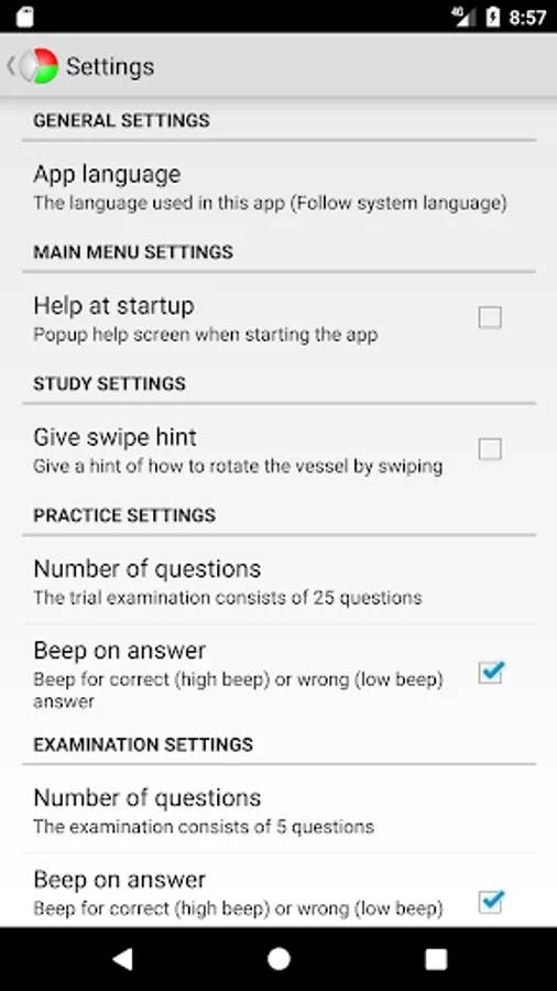 The app has some customization features such as choosing the amount of questions in the examination, whether to beep on correct/wrong answers, and the language.