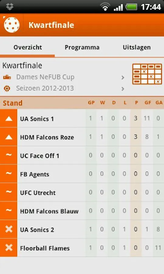 Slappshot is a - Dutch only - Android application which connects to all information on the website of the Dutch floorball federation (NeFUB) via a newly developed API. That means that when competition-related information is added (e.g. planned matches or results), you'll find it on your phone instantly!