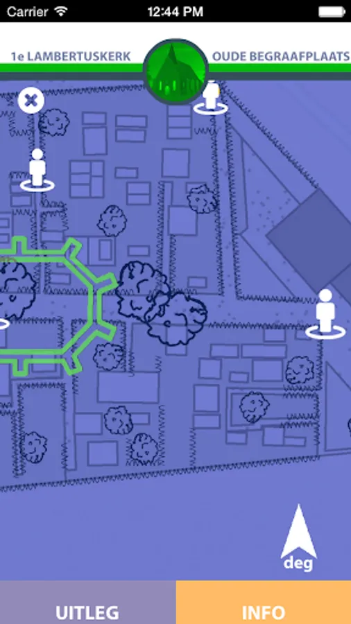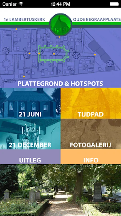 The home screen gives you the option to click on the map and through the designated hotspots (orange dots) the church in different locations to view in 3D. The map shows the basic contours (green) where the church has previously stood. If you open the map and walk to an orange dot on the cemetery and tap the dot appear two images together: you can see live the cemetery, and through an impression of 1839, how the church has stood there. Using the slider at the bottom of the image, you can determine how sharp you want to see the picture of the past. All eight spots give another 3D image