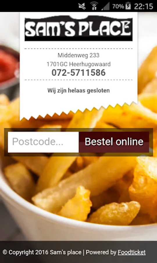 With Sam's Place app you order safe and fast tastiest fries, burgers and other snacks Heerhugowaard and surroundings. Pay directly online through your own bank with iDeal!