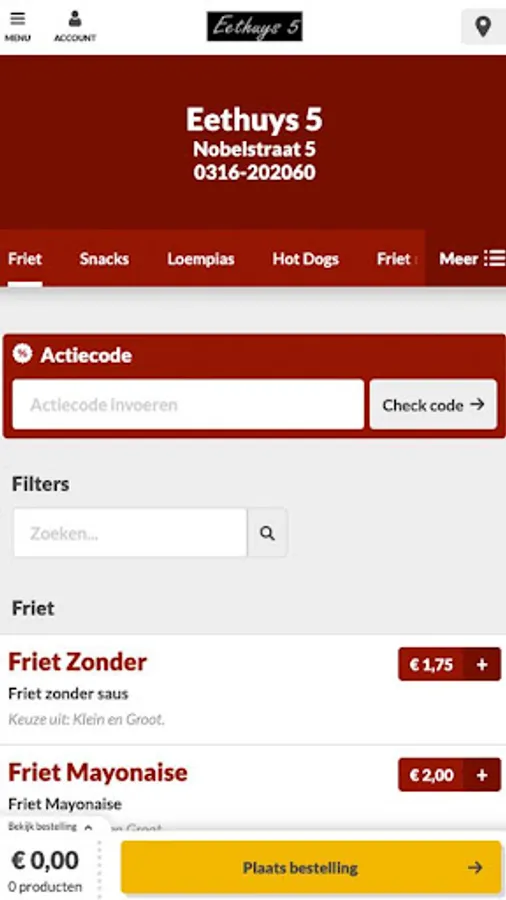 With the Eethuys 5 app you can order the tastiest fries, hamburger, snack, sandwiches and more from Zevenaar and the surrounding area quickly and safely. Pay directly online through your own bank with iDEAL!