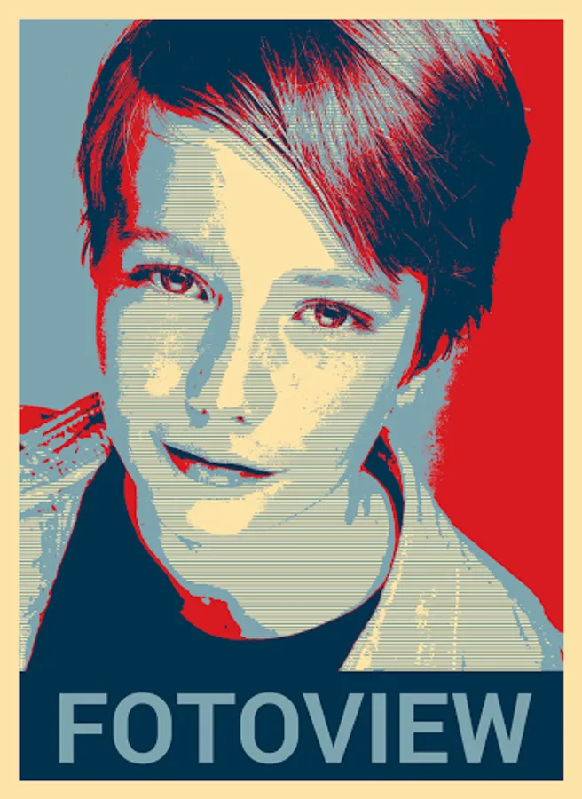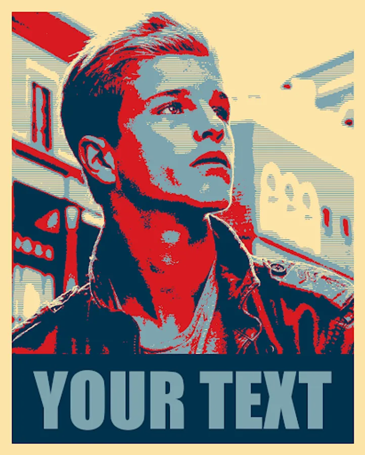 The effect is inspired by Sheppard Fairey's famous political poster series for the Obama campaign, 'HOPE', 'YES WE CAN'.