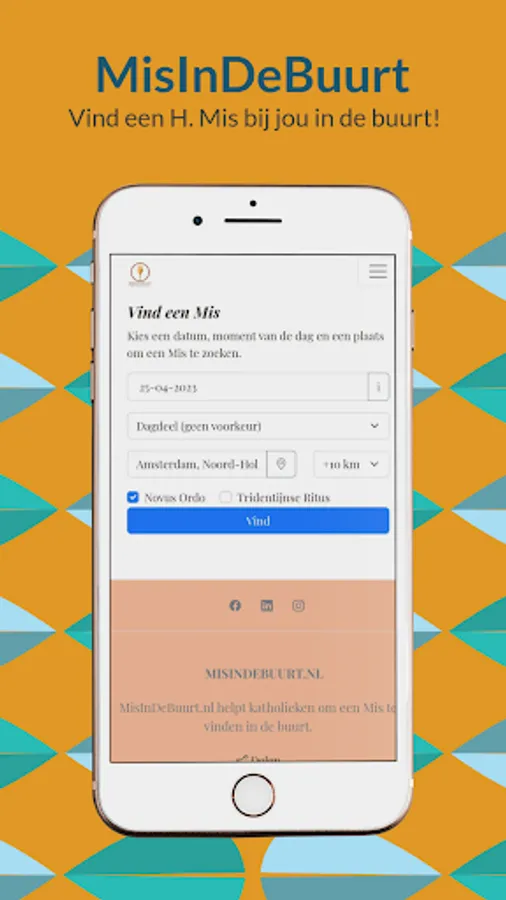 MisInDeBuurt is a website and app that helps you find a Holy Mass near you, even if you are on a vacation or a business trip in the Netherlands or Belgium. Although there are already several websites to find a Holy Mass near you, they often have their limitations. For example, the Holy Mass times are not always up-to-date.