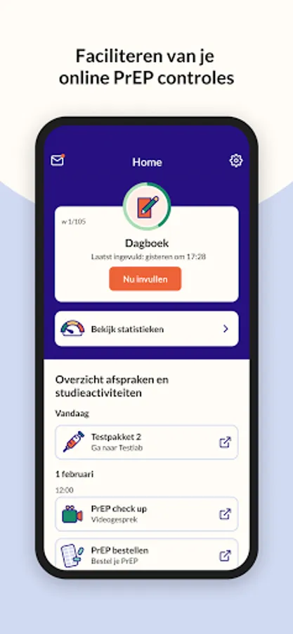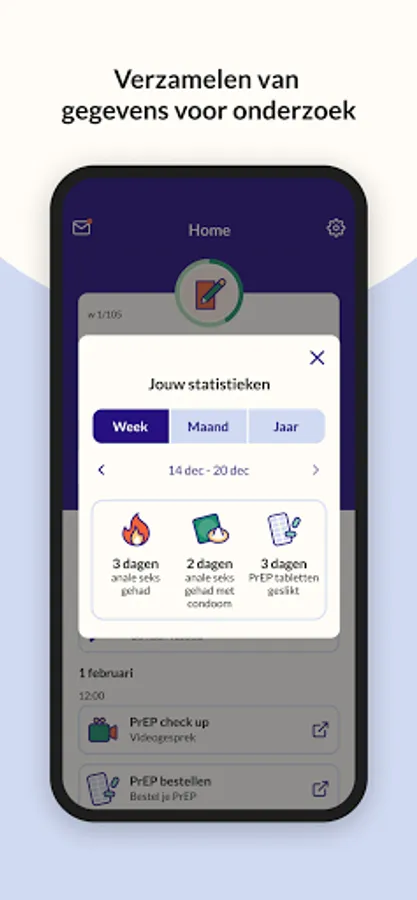 Via the app, the participants of the EZI-PrEP study have access to all study-related activities such as the questionnaires and the electronic diary. All participants are requested to keep a daily electronic diary of their PrEP medication intake. The information that the participants provide in the app enables the researchers to study adherence to PrEP (Pre-exposure prophylaxis). The study may yield important information for the GGD to lower barriers to PrEP-care and prevent new HIV infections.