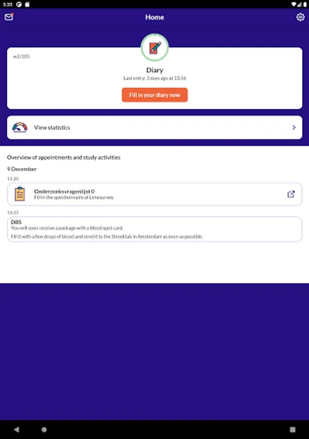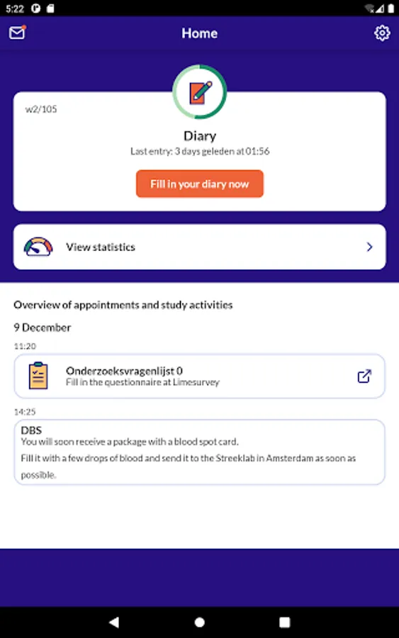 The app can send the study participants a reminder so that they do not forget to fill-out the diary. The participant can turn off the reminder. Participants can view their entered data. The GGD can send the participants messages, which end up in the inbox of the app.