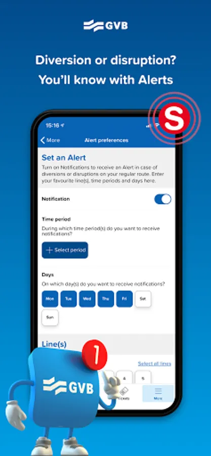 - Alert for disruptions: turn notifications on for your favourite line(s). You will receive an Alert if there’s a diversion or disruption. You can set this for certain days and time periods.