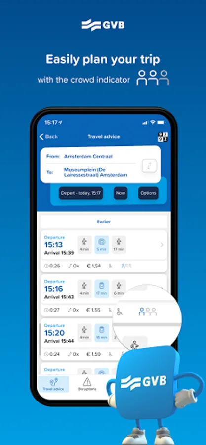 - Crowd indicator: in each requested travel advice, you can immediately see how busy a service is expected to be.