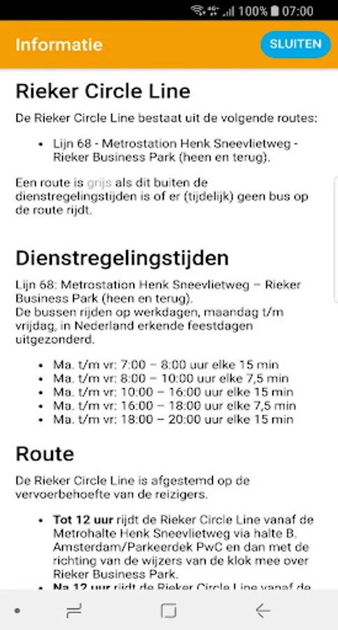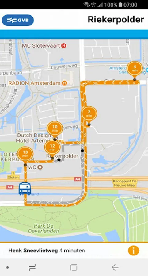 Use this app to follow the GVB buses around Riekerpolder. See live on the map how long it takes for the bus or shuttle to get to your stop.