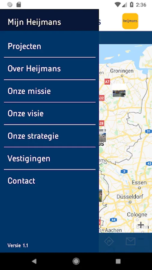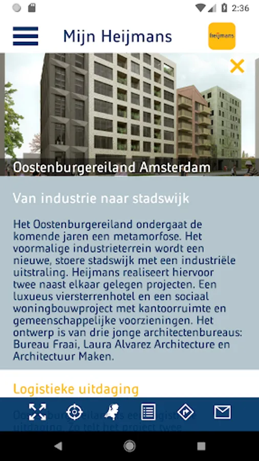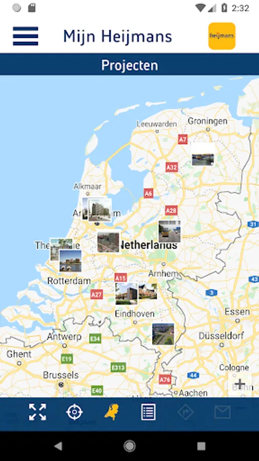 With the Heijmans app you can get information about projects in the field of housing and infrastructure in your neighborhood and on the road. You can see the progress of the construction of your new house, or the new road being built in your immediate area or on your travel route. You can see when you may be inconvenienced by our construction work. In addition, the app simply offers the possibility to ask questions or comment on our projects, for example if you have a complaint about implementation. The app also offers the possibility to navigate to a project, so that subcontractors and their employees do not have to search.
