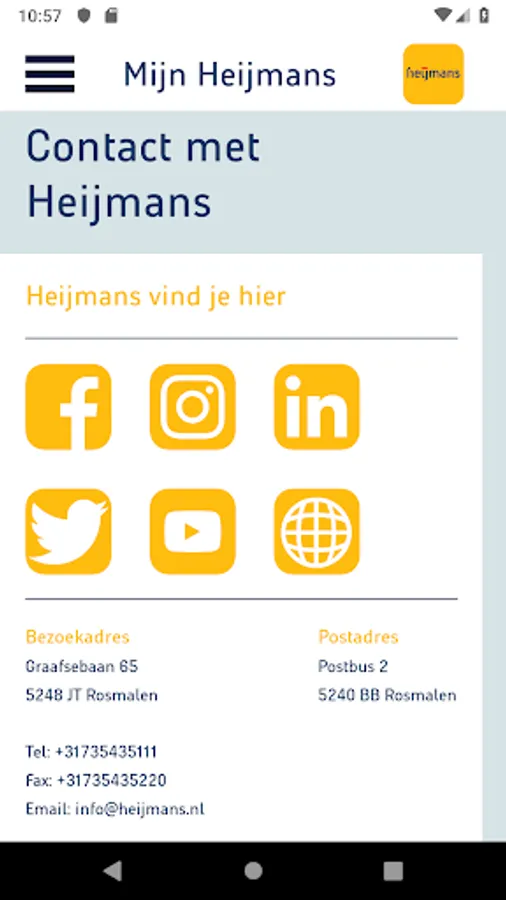 As an extra service, the app offers the possibility for you as a customer or client to easily find and select a Heijmans site, find the right address, call the site directly or let you navigate to it, so you can easily find your way - both in our organization and on the way to it.