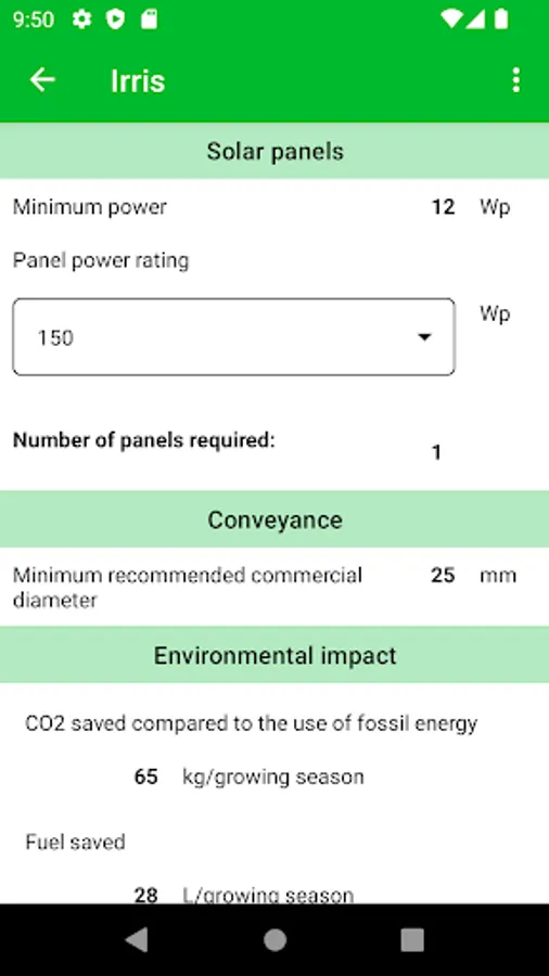 The application facilitates calculations related to the sizing of irrigation systems and the choice of pumps and solar panels.