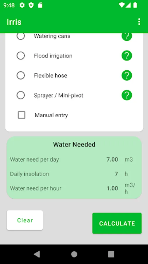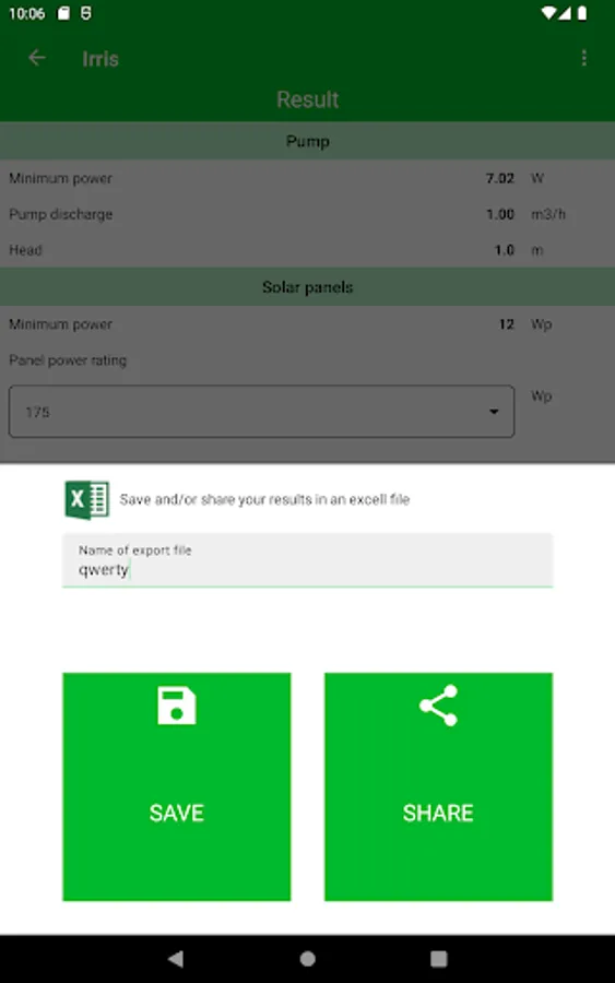 Then click on Calculate and you will get the results needed to choose a suitable pump (discharge, head, power needed).