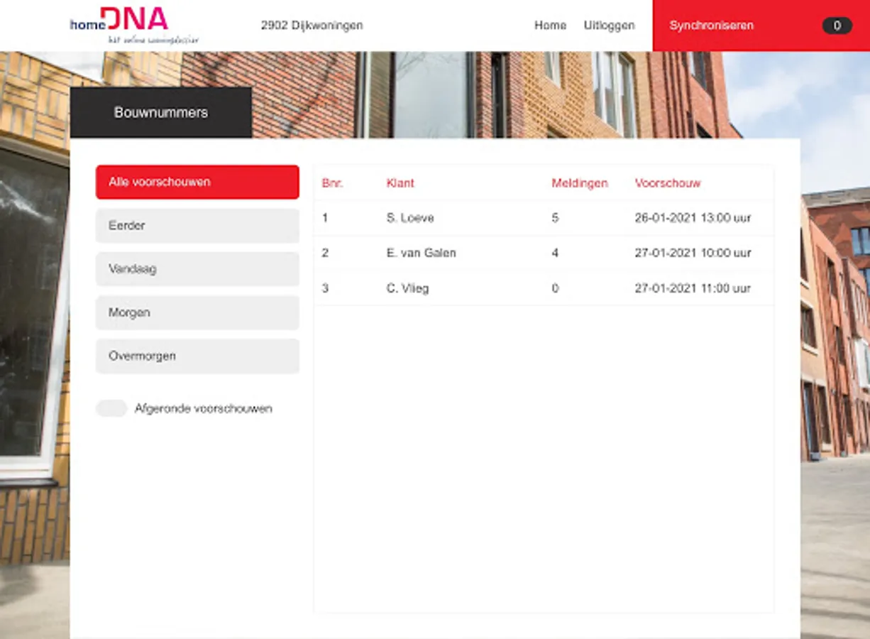 The Pre-assessment app is the digital tool on the construction site, with which the buyer can efficiently carry out the pre-inspection (pre-delivery) before the delivery of his home. During this preliminary assessment, the buyer can report points that require extra attention before the house is delivered. These points can be indicated per floor and room on the map and provided with a description and photos. The reports from the Voorschouw app are further processed by the contractor and, if necessary, passed on to the suppliers. The Voorschouw app is part of the Construction Quality app and is synchronized with the web application and the buyer's housing file. This contains all the necessary current information about the project and this can be followed by the parties involved.