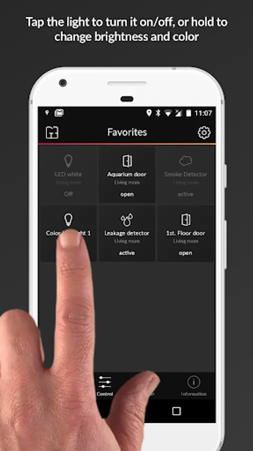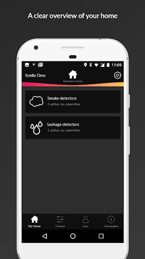 The cards in your home tab give a clear overview of your home, and the device tiles in the control tab allow for easy and fast control of all your accessories.